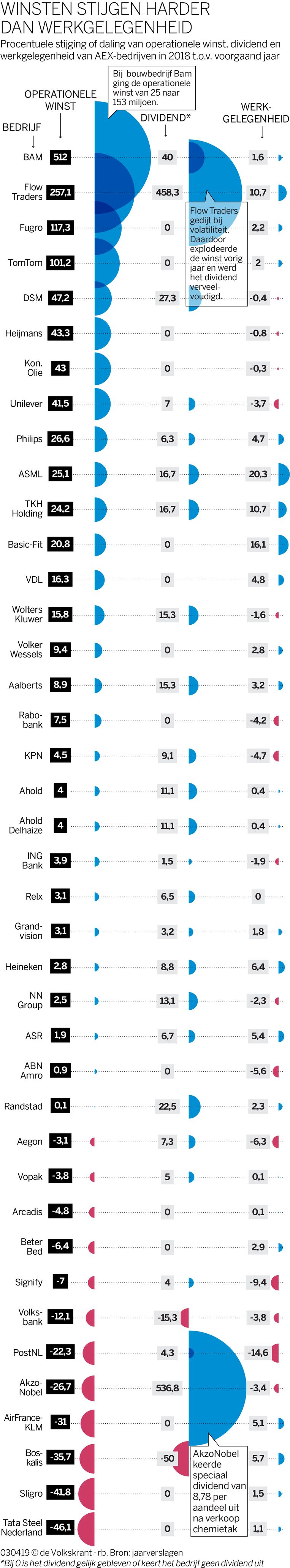 In vijf jaar tijd is de winst bij beursfondsen verdubbeld van 33 naar 66 miljard. Maar het aantal banen is nauwelijks gestegen en mogelijk zelfs gedaald. Vanwege grote overnamen, fusies en afsplitsingen kunnen de cijfers van nu – in totaal werkten volgens cijfers van Euronext ultimo vorig jaar 1,8 miljoen mensen in binnen- en buitenland bij de beursfondsen – niet met vijf jaar geleden worden vergeleken. Zo is Ahold in die periode samengegaan met Delhaize, terwijl AkzoNobel en Unilever onder druk van aandeelhouders grote delen van hun bedrijf hebben moeten afsplitsen – respectievelijk de chemietak en de margarinedivisie. Maar bij de meeste bedrijven loopt de werkgelegenheid terug.