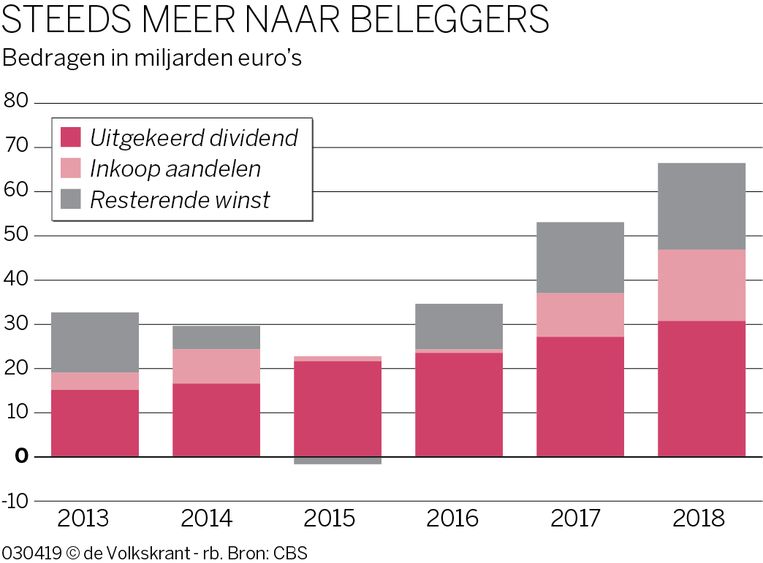 In totaal stroomt er 46 miljard euro van de op de beurs genoteerde bedrijven naar aandeelhouders. Dat is 70 procent van de totale winst. Ter vergelijking: in 2013 keerden beursfondsen van 33 miljard aan behaalde winst 19 miljard (15 miljard aan dividend en 4 miljard) aan beleggers uit: 58 procent.