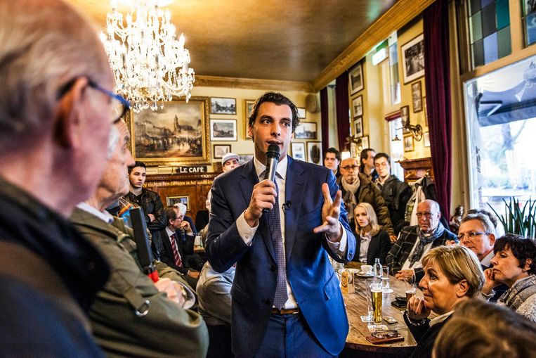 Het blijft plenzen in Venlo. Van het veroveren van de stad komt niet veel terecht. 'Gelukkig maar, anders had ik de hele middag moeten flyeren', lacht Baudet. De volgende stop is café De Verleiding in Roermond, waar de lijsttrekker een praatje houdt. Het is er stampvol: zelfs in de deuropeningen staan toehoorders. Zo gaat het altijd, vertellen campagnemedewerkers trots. Thierrý, zoals zij de naam van hun leider uitspreken, trekt honderden mensen naar bijeenkomsten, of die nou in Amsterdam of Emmen zijn.
