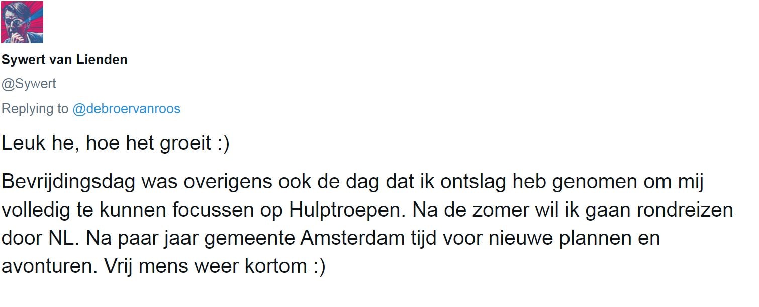 Sywert van Lienden viert 5 mei 2020 zijn eigen bevrijdingsdag: hij neemt ontslag bij de gemeente Amsterdam. Het ambtenarenbestaan bevalt hem al langer niet meer. Hij gaat zich helemaal richten op Hulptroepen, meldt hij op twitter. ‘Best wel spannend met recessie voor de deur, hypotheek en studieschuld maar hey: als je niks verandert blijft alles ook hetzelfde.’