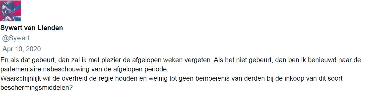 ‘Er is nul eigen gewin in deze’, verzekert Van Lienden in mei 2020 op twitter als een Nederlandse ondernemer in China kritiek levert (‘Wij kennen de prijzen goed in China. Er wordt door jullie winst gemaakt’). ‘Ik doe het om niet en heb m’n werk opzijgezet. De accountant houdt toezicht.’