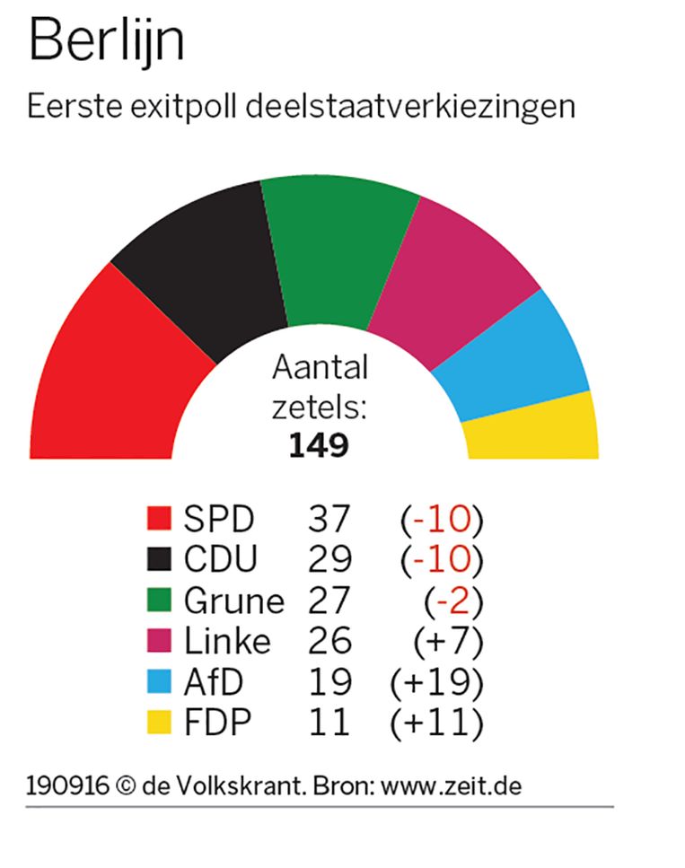 Bij de deelstaatverkiezingen in Berlijn is de SPD de grootste partij geworden. Maar de sociaaldemocraten zijn tegelijkertijd de grootste verliezers, samen met coalitiepartner CDU. AfD komt uit het niets op 13 procent. Dat is veel in de als links bekend staande Duitse hoofdstad.