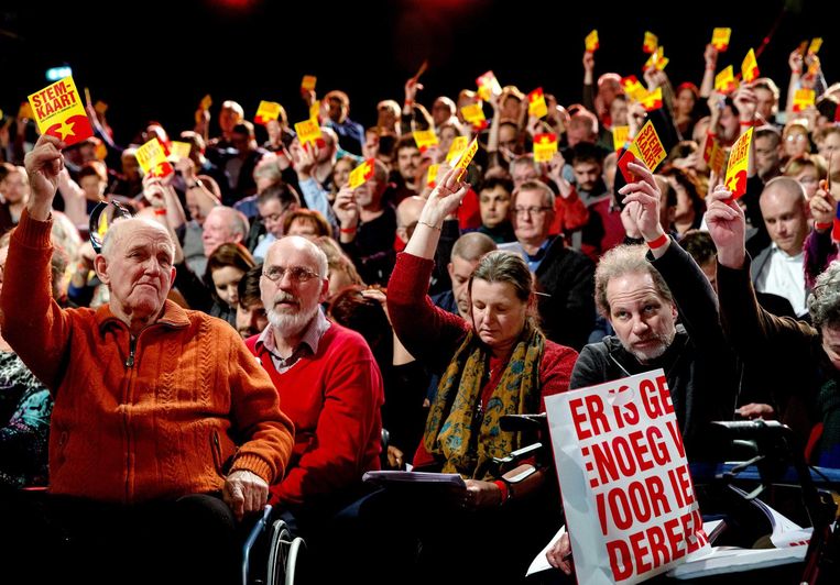 Hierna werden er vlaggen in de felle campagnekleuren rood, groen, geel en roze langs het podium gedragen (dat vanwege deze kleurstelling nog het meest deed denken aan het decor van een TV-quiz uit de vroege jaren negentig) met daarop slogans als 'huur = duur' en 'stop boete op ziek zijn'. De zaal juichte 'actie, actie, actie'. 'Dan zou ik zeggen: aan het werk!', besloot Roemer. 'Pak de macht! Zet hem op.'