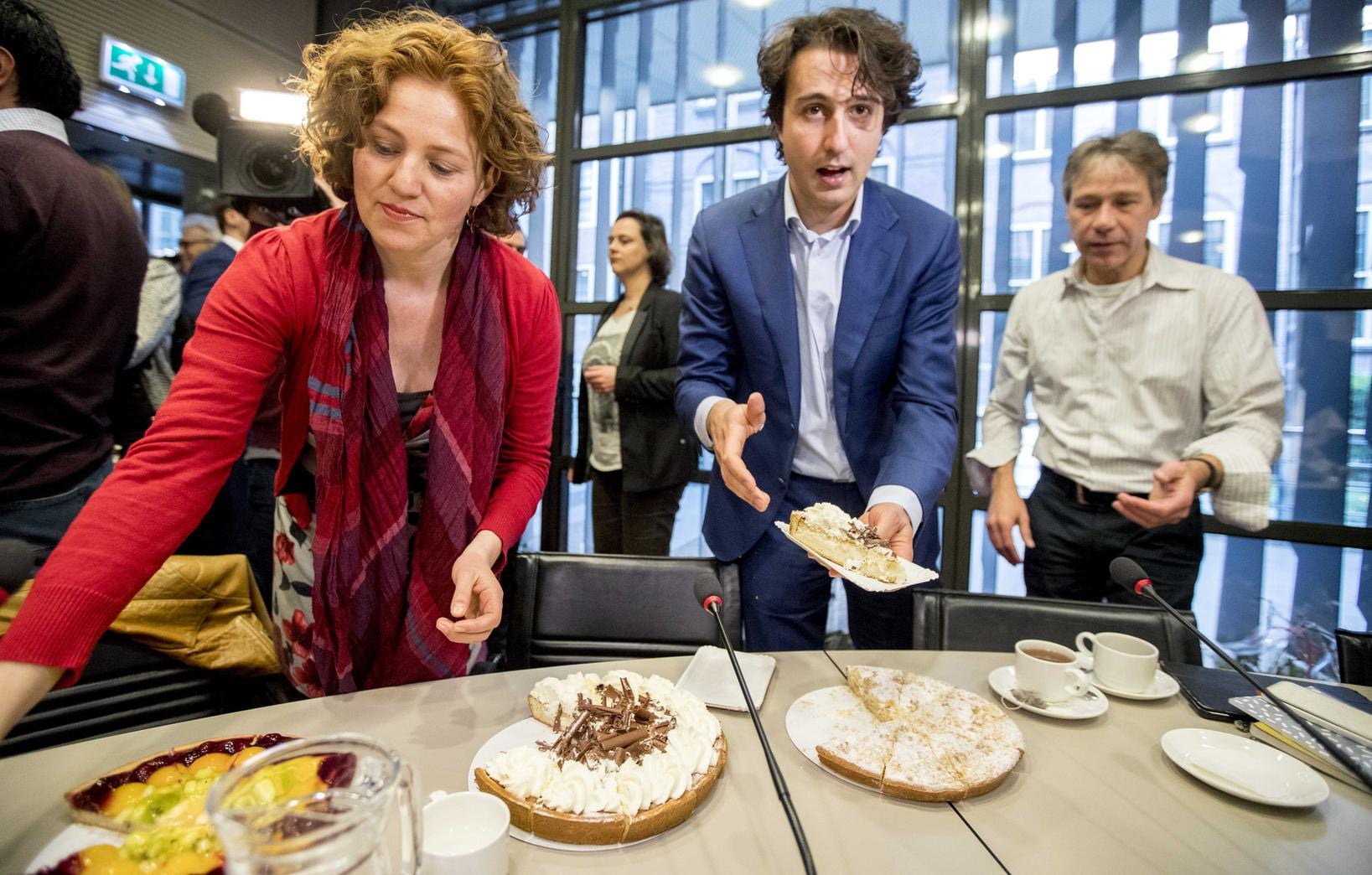 Bij de VVD was er geen taart om de overwinning te vieren, maar er waren wel soesjes. Bij GroenLinks, 50Plus en de ChristenUnie stond wel gebak klaar, de Partij voor de Dieren en D66 hadden ook champagne in huis gehaald en bij de PVV waren er slingers opgehangen.