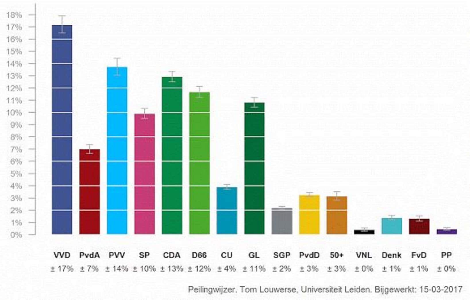 VVD-leider en premier Mark Rutte bracht rond 10.00 uur zijn stem uit in een school in Den Haag. Rutte riep iedereen op van zijn stemrecht gebruik te maken. 'Dat is een verworvenheid en daar is voor geknokt door heel veel mensen.' PVV-leider Geert Wilders stemde onder veel belangstelling van de internationale media in de basisschool De Walvis in Den Haag. Jesse Klaver (GroenLinks) stemde bij een boekhandel in Den Haag. Dat u het even weet.