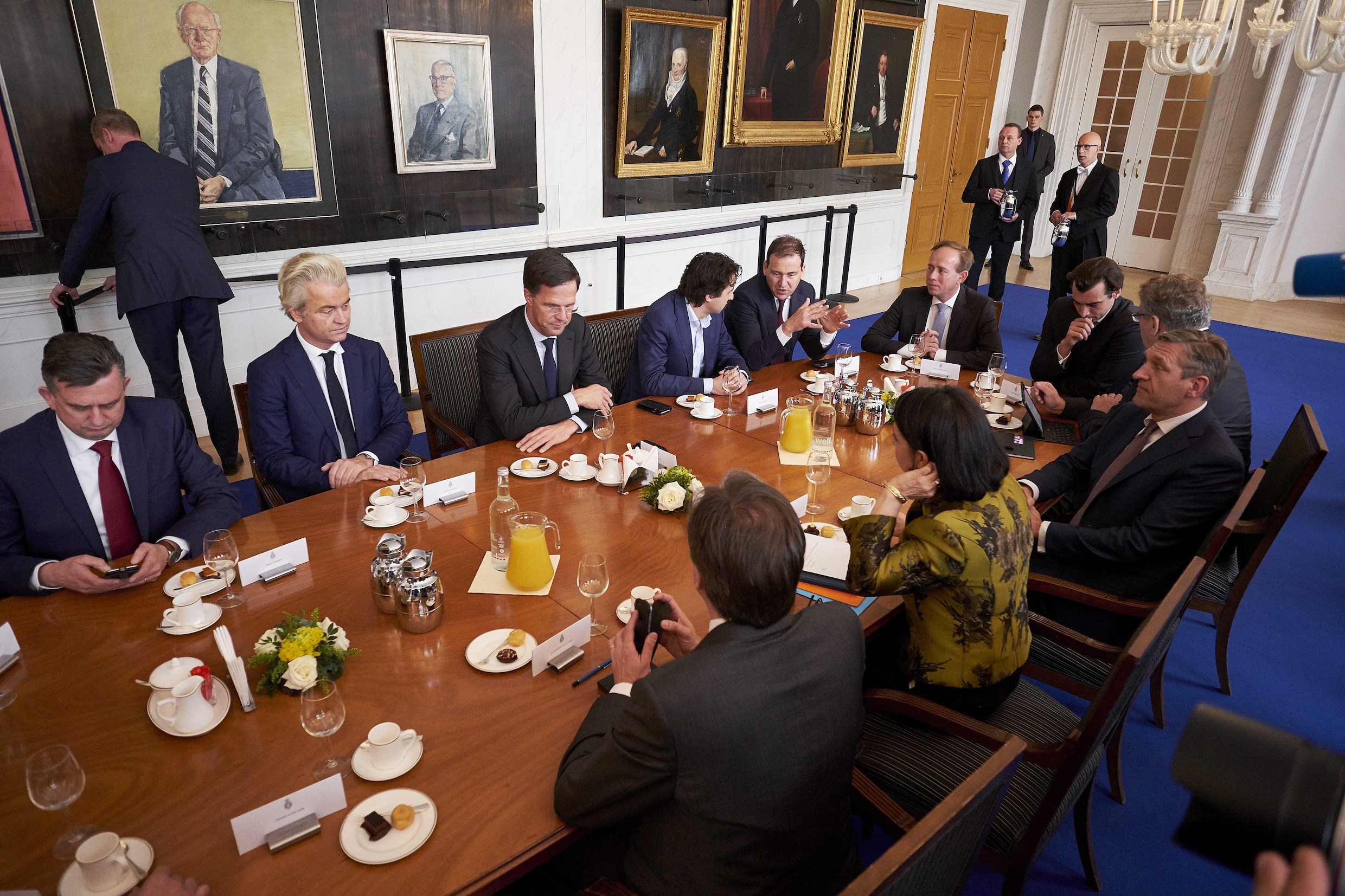 Alle partijleiders komen op dit moment op uitnodiging van Kamervoorzitter Arib bijeen in de Rooksalon, de statige zaal grenzend aan de oude Tweede Kamer. Sinds 2012 is de kabinetsformatie geheel een aangelegenheid van het parlement en heeft de koning daar geen rol meer in. In plaats van de koning gaat een verkenner de komende dagen de mogelijkheden inventariseren.