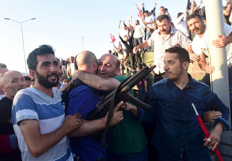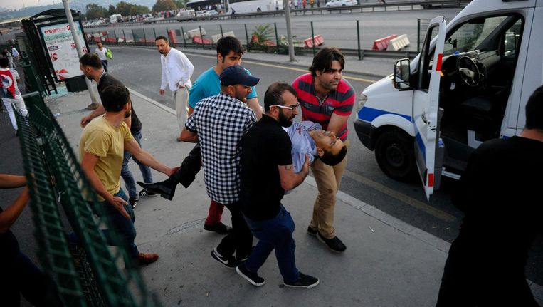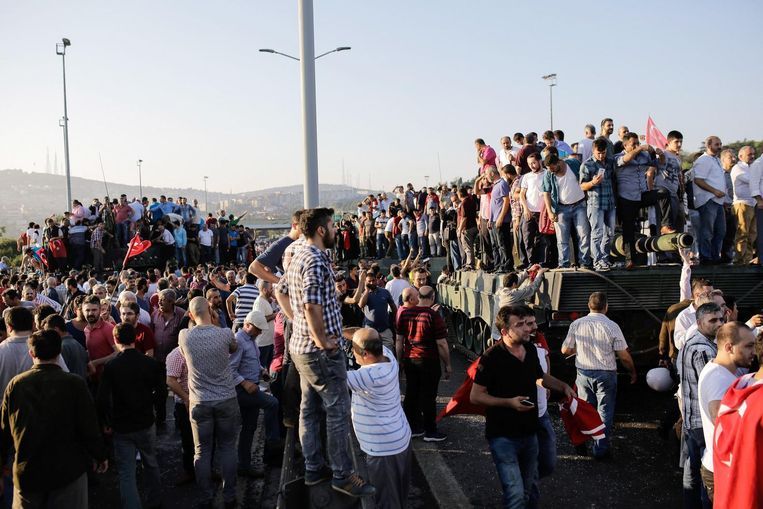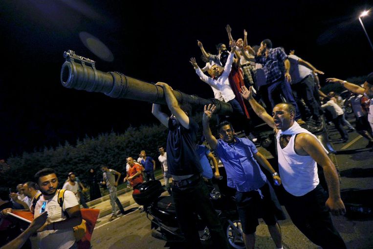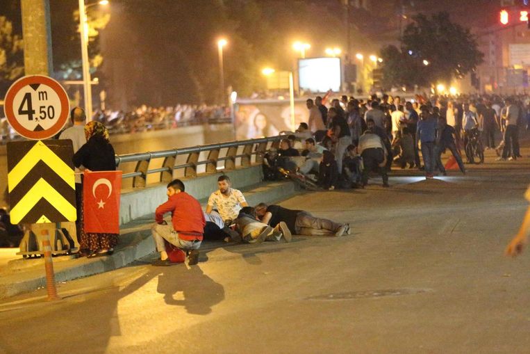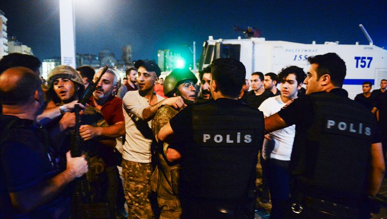* Erdogan riep zijn achterban op zich te verzamelen op pleinen en bij luchthavens, waar ook gehoor aan wordt gegeven. Op een van de pleinen in Istanbul is over de hoofden van de demonstranten heen geschoten. De aanwezigen doken naar de grond. Niet bekend is of mensen gewond zijn geraakt.