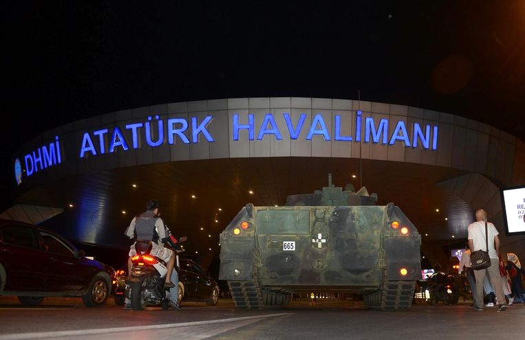 De Turkse televisie liet beelden zien van tanks bij het vliegveld Ataturk van Istanbul.