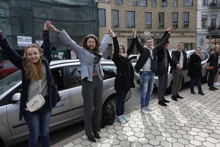 Honderden studenten hebben dinsdag in de Oekraïense hoofdstad Kiev een flashmob georganiseerd. Ze vormden een 'menselijke ketting' die liep van de Nederlandse ambassade tot aan het Onafhankelijkheidsplein. Of, zoals de inwoners het zelf noemen: het Europaplein. Hun boodschap aan de Nederlandse kiezer: stem vandaag 'ja'.
