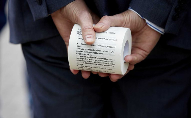 Hij was de tweede stemmer op zijn bureau vanmorgen. Eén iemand was hem voor: minister van Financiën en voorzitter van de Eurogroep Jeroen Dijsselbloem. Ook Dijsselbloem is een voorstander van het verdrag, begin maart schreef hij in NRC: 'Niet alleen de bevolking van Oekraïne heeft een groot belang bij het aanpakken van corruptie en misdaad, bij het op gang helpen van de economie, bij een goed bestuur van Oekraïne, maar ook haar Europese buren. En daar gaat dit verdrag over.'