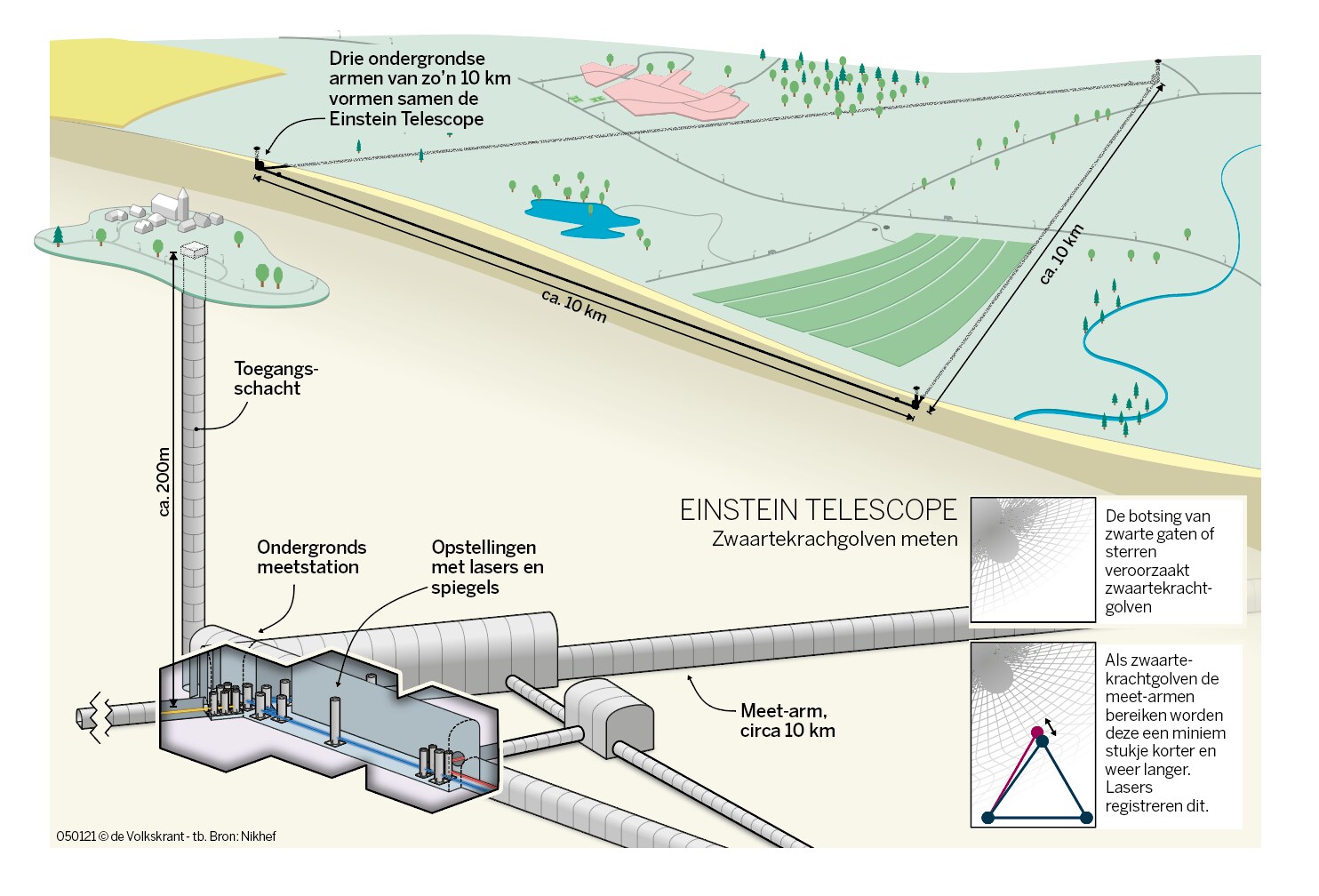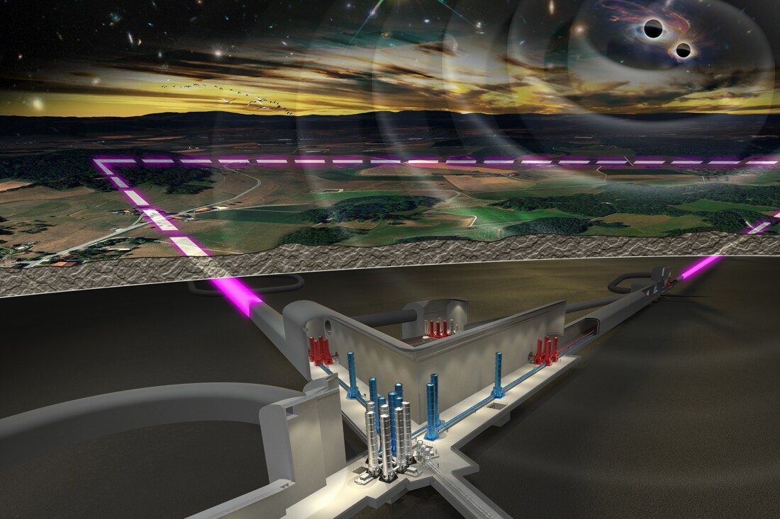 Zo’n 100 duizend tot een miljoen keer méér meetgegevens dan de huidige generatie verzamelt. Dat is wat we – onder meer – mogen verwachten van de Einstein Telescope, zegt fysicus Gideon Koekoek (Universiteit Maastricht, deeltjesinstituut Nikhef). Dat mega-experiment moet de opvolger worden van zwaartekrachtsgolfdetectoren Ligo (in de Verenigde Staten) en Virgo (in Italië). Die instrumenten kunnen de rimpeling meten die door ruimte en tijd trekt wanneer diep in de kosmos zeer zware voorwerpen op elkaar klappen.